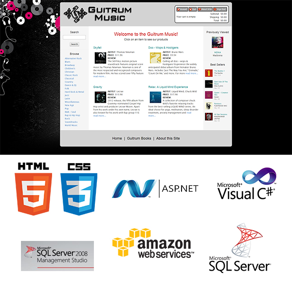 An online music store that uses Amazon Web Services to display real product information. Similar functions to the book store, but done with server-side programming, object oriented languages, C#, program architecture, debugging, and Visual Studio.